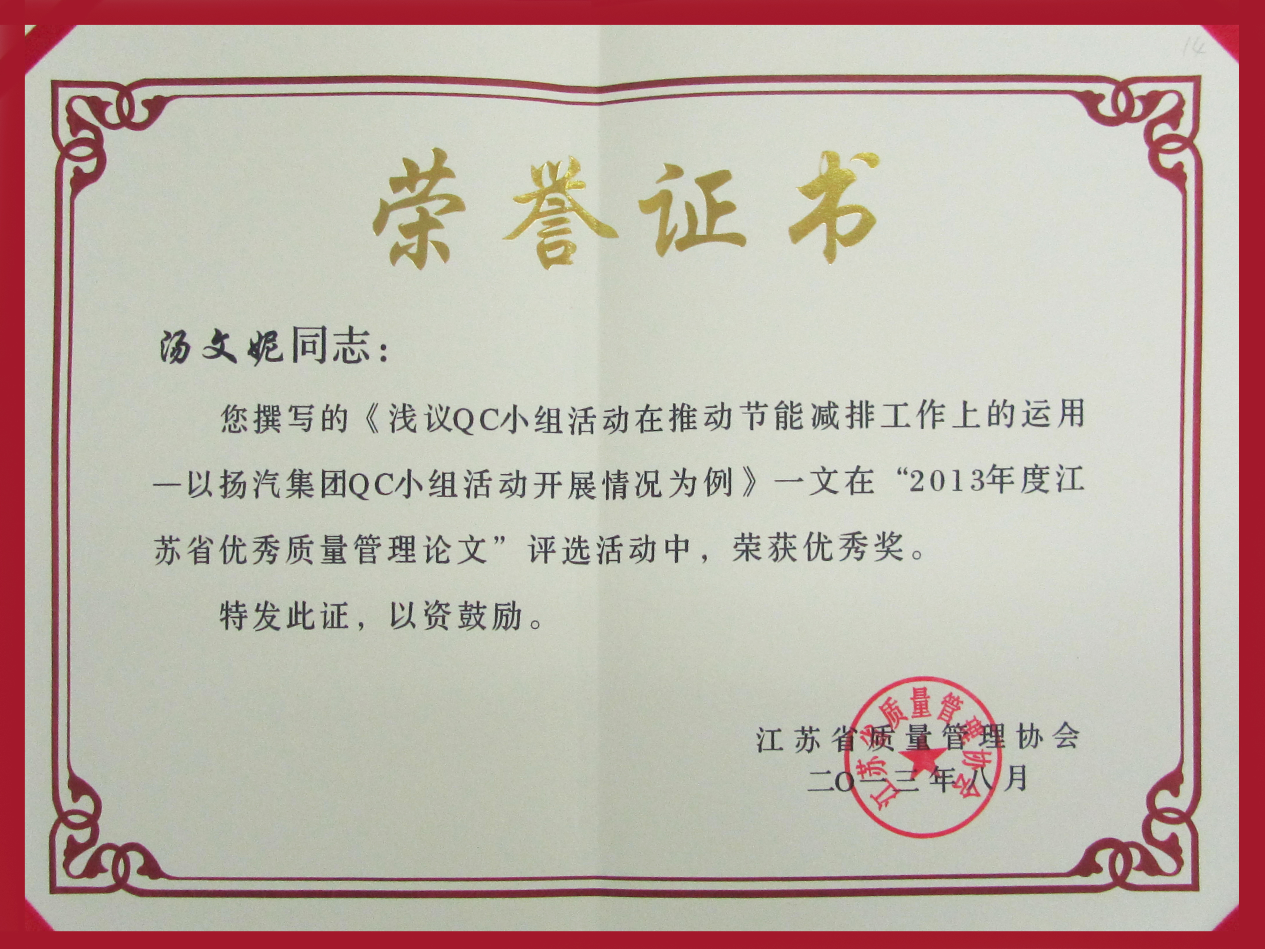 此外,集團(tuán)公司企業(yè)文化策劃處湯文妮的參賽論文《淺議QC小組活動(dòng)在推動(dòng)節(jié)能減排工作上的運(yùn)用——以揚(yáng)汽集團(tuán)QC小組活動(dòng)開(kāi)展情況為例》在“2013年度江蘇省優(yōu)秀質(zhì)量管理論文”評(píng)選活動(dòng)中榮獲優(yōu)秀獎(jiǎng)。