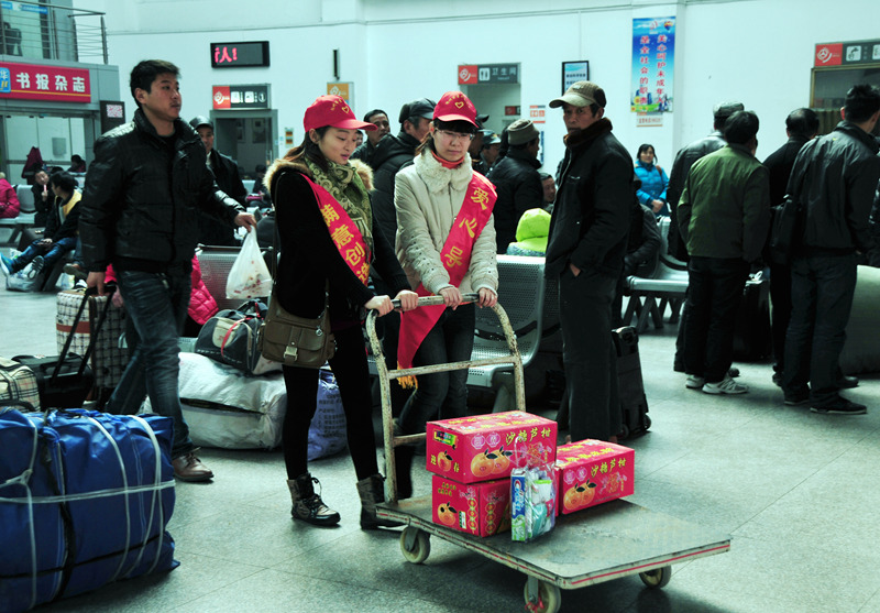 來(lái)自揚(yáng)汽集團(tuán)和團(tuán)市委組織的志愿者們有的在進(jìn)站口向旅客指引車(chē)站售票、候車(chē)等各個(gè)功能區(qū)位置;有的在服務(wù)臺(tái)回答旅客咨詢;有的在安檢處勸導(dǎo)旅客把攜帶的物品放上危險(xiǎn)品檢查儀安檢;有的推著“雷鋒車(chē)”幫行李較多的旅客拖運(yùn)箱包;有的給候車(chē)的旅客倒上一杯熱水;有的在檢票口幫助維持現(xiàn)場(chǎng)秩序,避免發(fā)生擁堵;還有的在候車(chē)大廳勸導(dǎo)旅客請(qǐng)勿吸煙……
