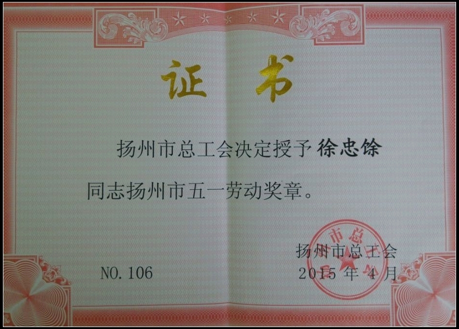 我司職工徐忠馀榮獲揚州市五一勞動獎章