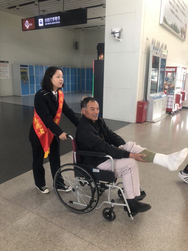 不一會(huì)兒,陪同的工友買好了當(dāng)天10:30分前往昆山的車票。高娟和另一位工作人員彭素青借來(lái)了輪椅,二人推著他來(lái)到了二樓發(fā)車檢票口,將他攙扶到座椅上坐好,并和發(fā)車班工作人員交接了尤師傅的情況,囑托他們多多照應(yīng),安排好一切后,高娟和彭素青才離開回到自己的工作崗位。尤師傅和工友都非常感謝揚(yáng)州站工作人員細(xì)心周到的服務(wù)。