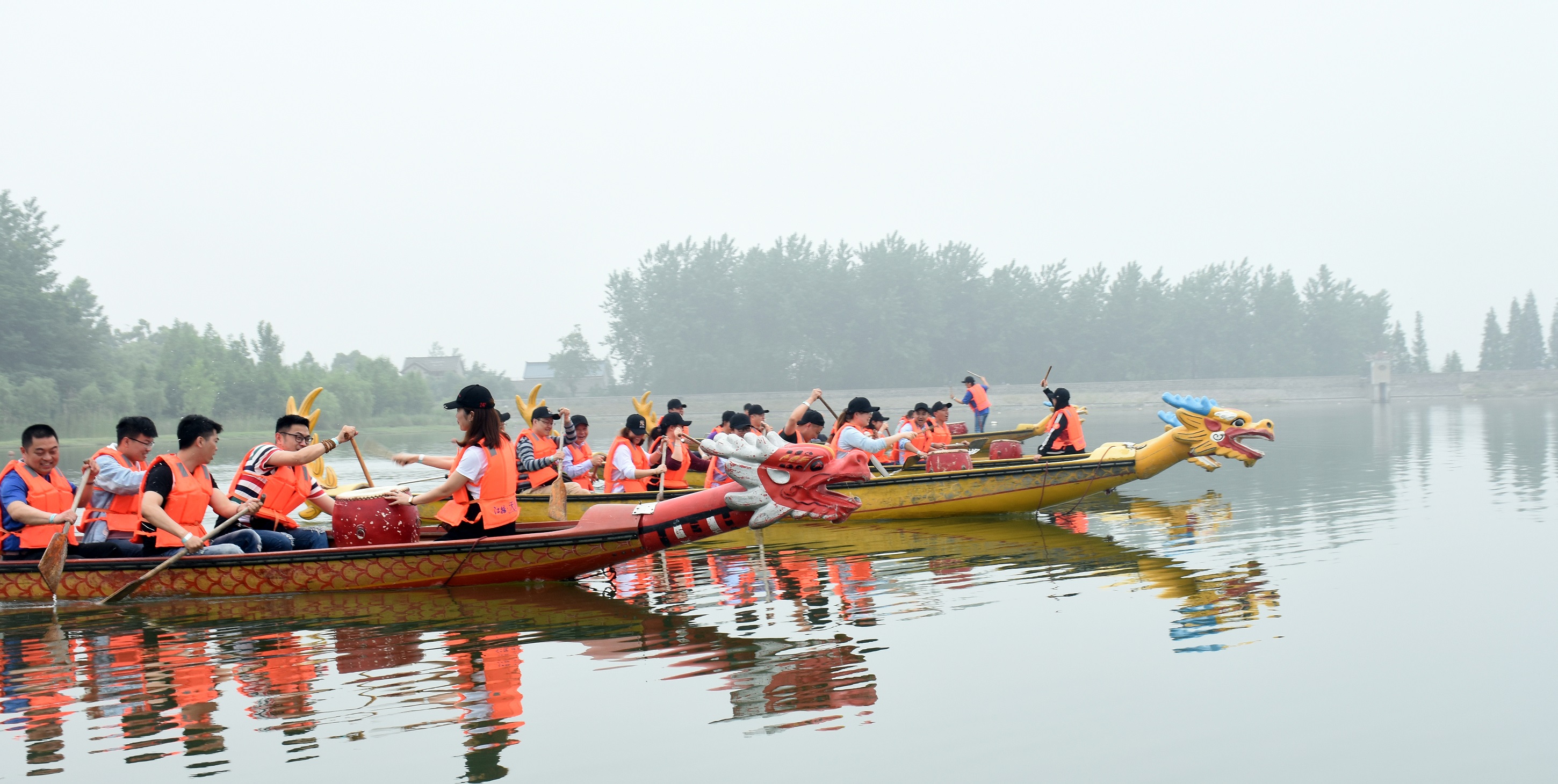 上午首個(gè)挑戰(zhàn)活動(dòng)是劃龍舟比賽。參加人員共分成4個(gè)小隊(duì),經(jīng)過(guò)簡(jiǎn)短的水上練習(xí)后,隨著裁判一聲令響,四條龍舟劈波斬浪,隊(duì)員們擼起袖子、甩開膀子、擊鼓號(hào)令,揮橈劃槳,近500米的賽道上,大家同舟共濟(jì)、奮勇爭(zhēng)先。
