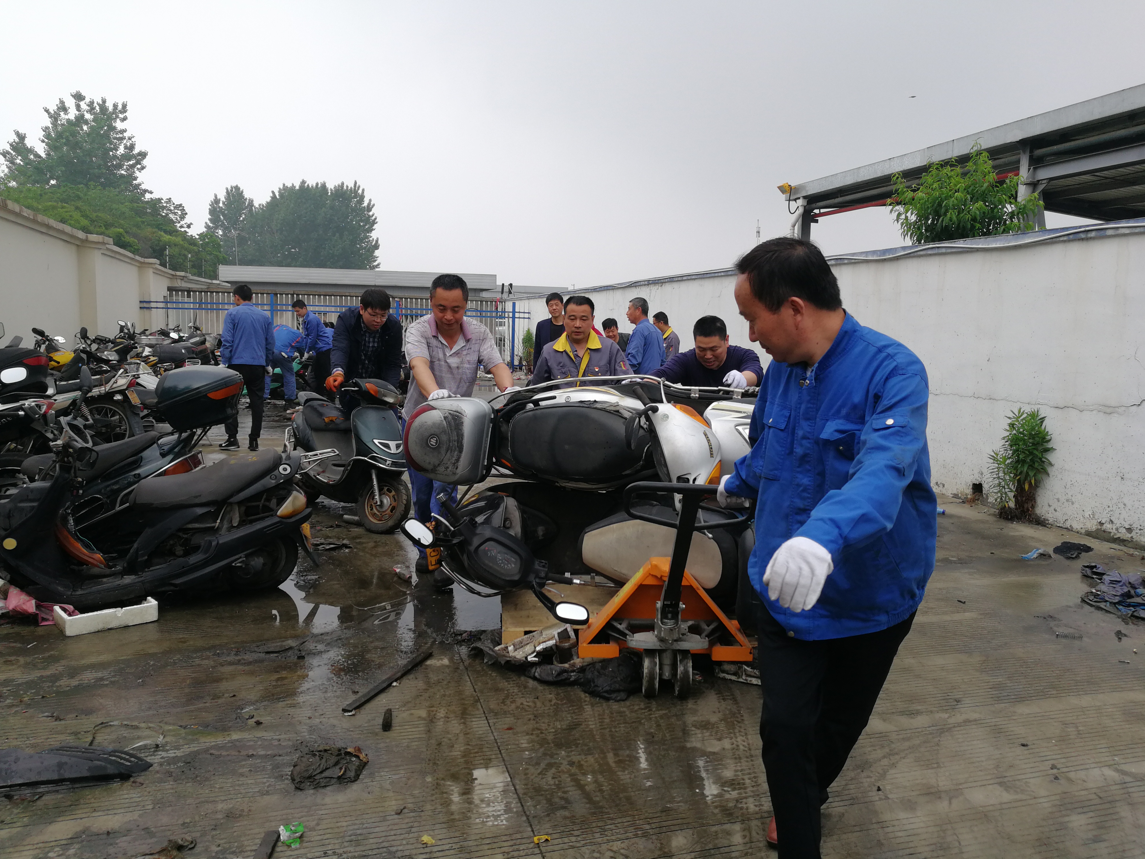 8時15分搬運工作正式開始,針對輪軸銹蝕、車輪變形、車輪遺失、車輪鎖死等不同情況的扣押車輛,大家使用車輪托架、電動三輪、托盤叉車等輔助搬運工具,共同協(xié)作,聽從指揮,一步一步移至指定區(qū)域。經(jīng)過兩個半小時的高效協(xié)作,大家克服場地臟亂和天氣的悶熱,將靠近天燃氣加氣站一側(cè)的車輛全部清理完畢,扣押場地車輛在指定停放區(qū)域擺放整齊,消除了安全隱患。