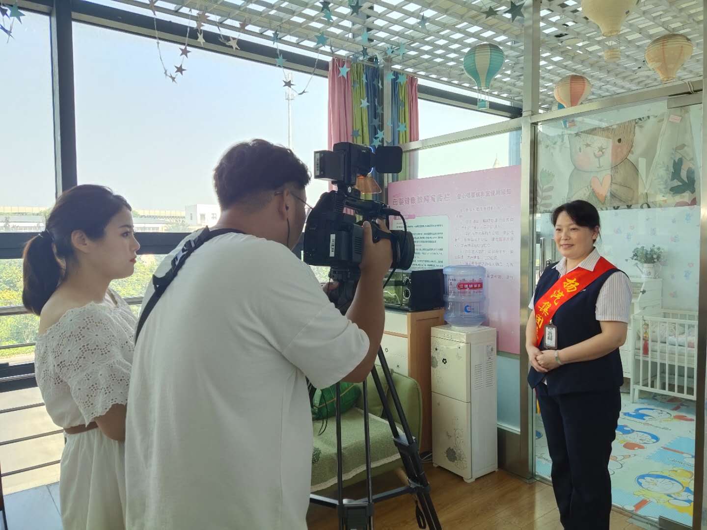 此次采訪主要以文明驛站——愛心母嬰室為主題,采訪過程中揚(yáng)州站負(fù)責(zé)母嬰室服務(wù)的班長尹海霞對母嬰室的功能及服務(wù)進(jìn)行了詳細(xì)的解說。