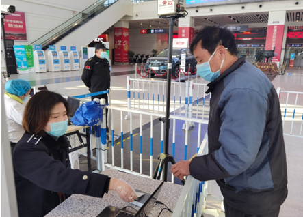 進(jìn)站口,車站的工作人員嚴(yán)格佩戴口罩,手套,正對進(jìn)站乘車的旅客進(jìn)行體溫、健康碼、身份證等的檢查。