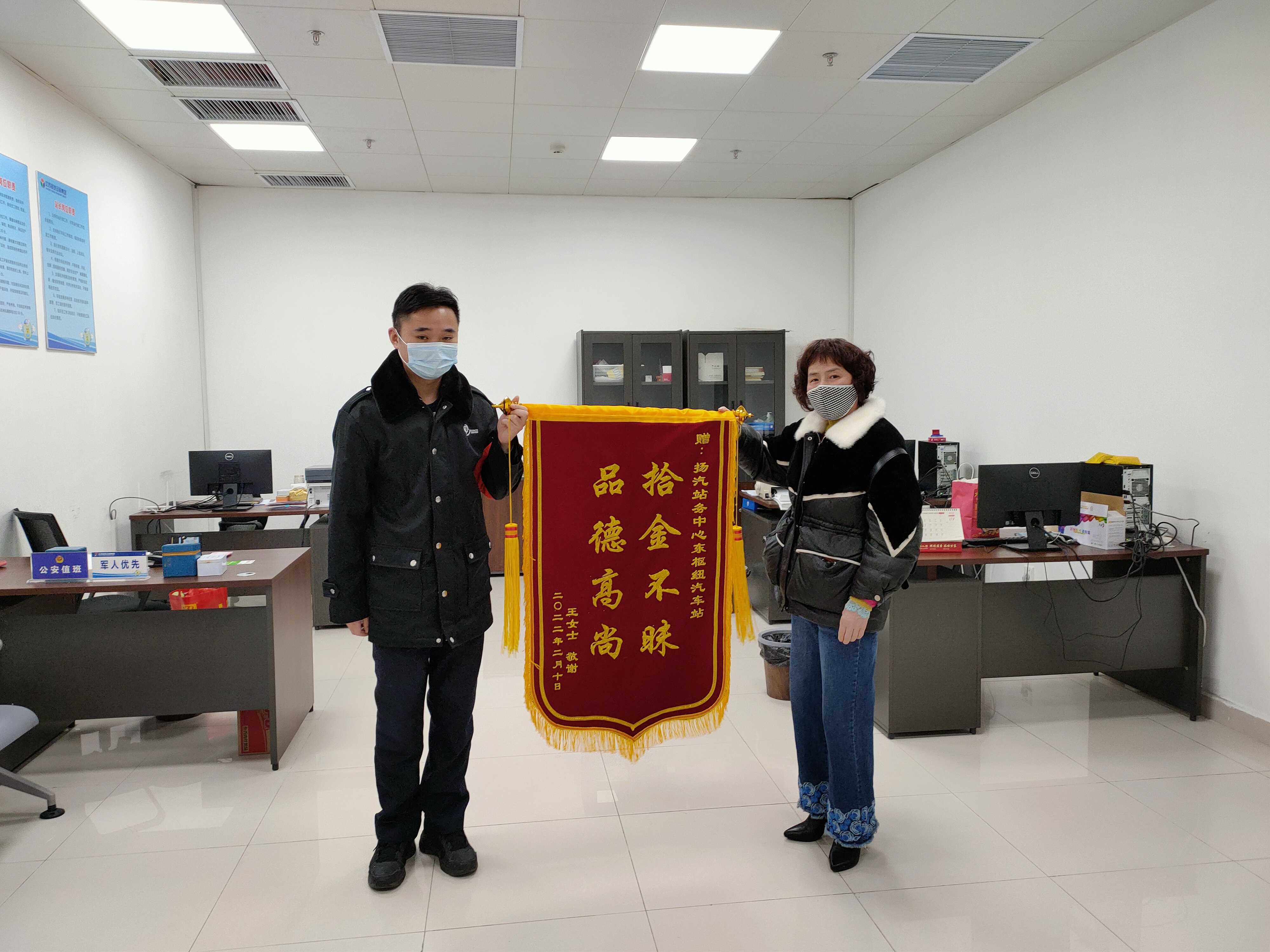 2月8日下午18:00,揚(yáng)州東樞紐汽車站至泰州南站最后一班車即將發(fā)車,臨近發(fā)車點(diǎn),一名旅客匆匆在售票處購票后帶著行李上二樓乘車,此時(shí)值班員姜衛(wèi)軍突然接到服務(wù)臺電話,售票員李玲說道,剛才有名旅客為了趕泰州班車,錢包落在了售票臺上。姜衛(wèi)軍隨即趕到現(xiàn)場,經(jīng)問詢,該班車已準(zhǔn)點(diǎn)駛出車站,在與駐站民警溝通后,確認(rèn)錢包內(nèi)裝有3000元現(xiàn)金、社?般y行卡若干,為消除旅客的焦慮情緒,姜衛(wèi)軍也是第一時(shí)間與王女士取得聯(lián)系。